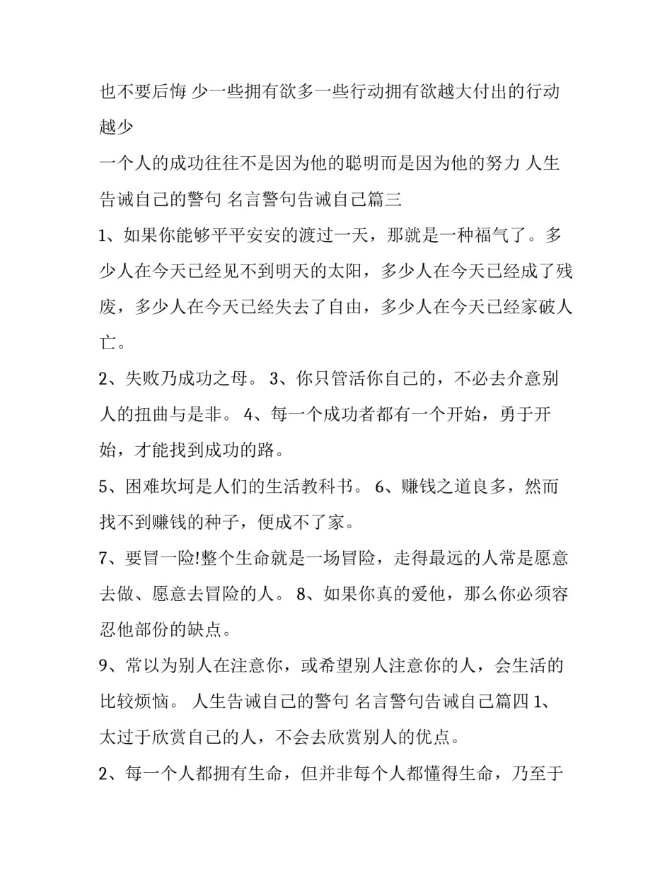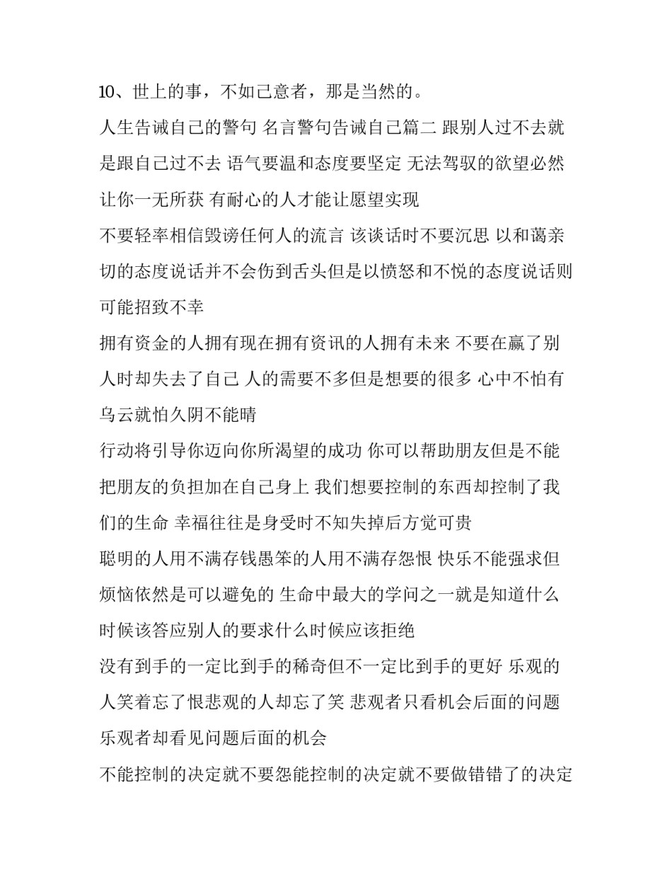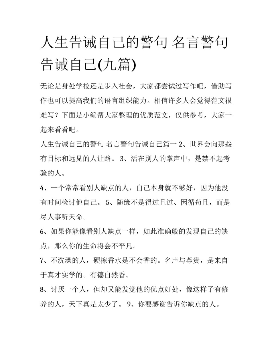 人生告诫自己的警句名言警句告诫自己(九篇)无论是身处学校还是步入社会,大家都尝试过写作吧,借助写作也可以提高我们的语言组织能力。相信许多人会觉得范文很难写?下面是小编帮大家整理的优质范文,仅供参考,大家一起来看看吧。人生告诫自己的警句名言警句告诫自己篇一2、世界会向那些有目标和远见的人让路。3、活在别人的掌声中,是禁不起考验的人。4、一个常常看别人缺点的人,自己本身就不够好,因为他没有时间检讨他自己。5、随缘不是得过且过、因循苟且,而是尽人事听天命。6、如果你能像看别人缺点一样,如此准确般的发现自己的缺点,那么你的生命将会不平凡。7、不洗澡的人,硬擦香水是不会香的。名声与尊贵,是来自于真才实学的。有德自然香。8、讨厌一个人,但却又能发觉他的优点好处,像这样子有修养的人,天下真是太少了。9、你要感谢告诉你缺点的人。10、世上的事,不如己意者,那是当然的。人生告诫自己的警句名言警句告诫自己篇二跟别人过不去就是跟自己过不去语气要温和态度要坚定无法驾驭的欲望必然让你一无所获有耐心的人才能让愿望实现不要轻率相信毁谤任何人的流言该谈话时不要沉思以和蔼亲切的态度说话并不会伤到舌头但是以愤怒和不悦的态度说话则可能招致不幸拥有资金的人拥有现在拥有资讯的人拥有未来不要在赢了别人时却失去了自己人的需要不多但是想要的很多心中不怕有乌云就怕久阴不能晴行动将引导你迈向你所渴望的成功你可以帮助朋友但是不能把朋友的负担加在自己身上我们想要控制的东西却控制了我们的生命幸福往往是身受时不知失掉后方觉可贵聪明的人用不满存钱愚笨的人用不满存怨恨快乐不能强求但烦恼依然是可以避免的生命中最大的学问之一就是知道什么时候该答应别人的要求什么时候应该拒绝没有到手的一定比到手的稀奇但不一定比到手的更好乐观的人笑着忘了恨悲观的人却忘了笑悲观者只看机会后面的问题乐观者却看见问题后面的机会不能控制的决定就不要怨能控制的决定就不要做错错了的决定也不要后悔少一些拥有欲多一些行动拥有欲越大付出的行动越少一个人的成功往往不是因为他的聪明而是因为他的努力人生告诫自己的警句名言警句告诫自己篇三1、如果你能够平平安安的渡过一天,那就是一种福气了。多少人在今天已经见不到明天的太阳,多少人在今天已经成了残废,多少人在今天已经失去了自由,多少人在今天已经家破人亡。2、失败乃成功之母。3、你只管活你自己的,不必去介意别人的扭曲与是非。4、每一个成功者都有一个开始,勇于开始,才能找到成功的路。5、困难坎坷是人们的生活教科书。6、赚钱之道良多,然而找不到赚钱的种子,便成不了家。7、要冒一险!整个生命就是一场冒险,走得最远的人常是愿意去做、愿意去冒险的人。8、如果你真的爱他,那么你必须容忍他部份的缺点。9、常以为别人在注意你,或希望别人注意你的人,会生活的比较烦恼。人生告诫自己的警句名言警句告诫自己篇四1、太过于欣赏自己的人,不会去欣赏别人的优点。2、每一个人都拥有生命,但并非每个人都懂得生命,乃至于珍惜生命。不了解生命的人,生命对他来说,是一种惩罚。3、时间总会过去的,让时间流走你的烦恼吧!4、来是偶然的,走是必然的。所以你必须随缘不变,不变随缘。5、福报不够的人,就会常常听到是非;福报够的人,从来就没听到过是非。6、欲知世上刀兵劫,但听屠门夜半声,不要光埋怨自己多病,灾祸横生,多看看横死在你手上的众生又有多少?7、承认自己的伟大,就是认同自己的愚疑。8、人不是坏的,只是习气罢了,每个人都有习气,只是深浅不同罢了。只要他有向善的心,能原谅的就原谅他,不要把他看做是坏人。9、其实爱美的人,只是与自己谈恋爱罢了。10、别人可以违背因果,别人可以害我们,打我们,毁谤我们。可是我们不能因此而憎恨别人,为什么?我们一定要保持一份完整的本性和一颗清净的心。11、你有你的生命观,我有我的生命观,我不干涉你。只要我能,我就感化你。如果不能,那我就认命。12、我的财富并不是因为我拥有很多,而是我要求的很少。13、活在别人的掌声中,是禁不起考验的人。14、永远不要浪费你的一分一秒时间去想任何你不喜欢的人。15、恶...