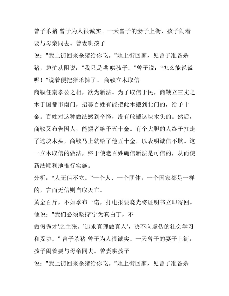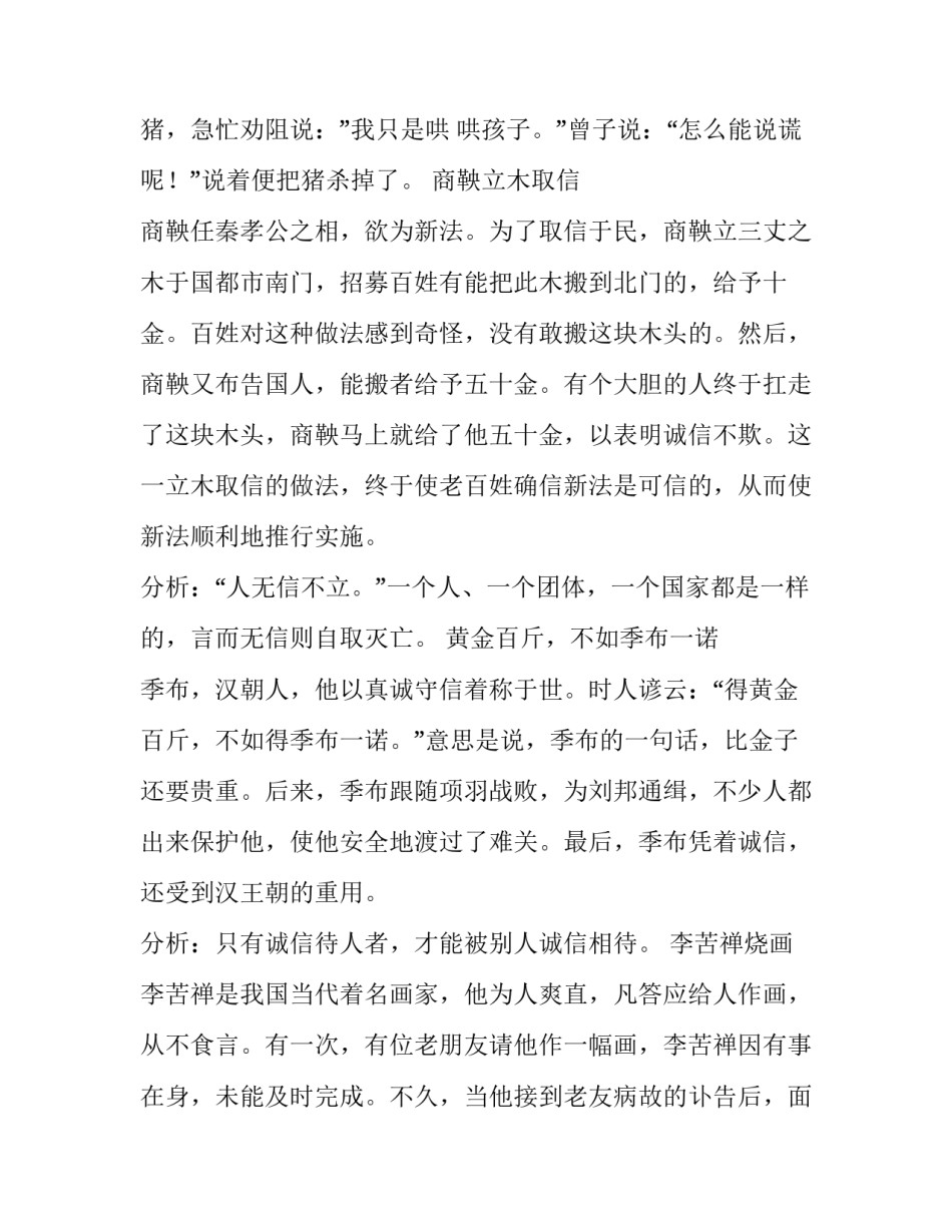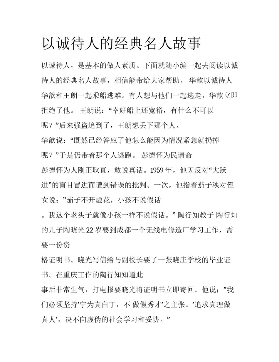以诚待人的经典名人故事以诚待人,是基本的做人素质。下面就随小编一起去阅读以诚待人的经典名人故事,相信能带给大家帮助。华歆以诚待人华歆和王朗一起乘船逃难。有人想与他们一起逃走,华歆立即拒绝了他。王朗说:“幸好船上还宽裕,有什么不可以呢?”后来强盗追到了,王朗想丢下那个人。华歆说:“既然已经答应了他怎么能因为情况紧急就扔掉呢?”于是仍带着那个人逃跑。彭德怀为民请命彭德怀为人刚正耿直,敢说真话。1959年,他因反对“大跃进”的盲目冒进而遭到错误的批判。一次,他指着茄子秧对侄女说:”茄子不开虚花,小孩不说假话。我这个老头子就像小孩一样不说假话。”陶行知教子陶行知的儿子陶晓光22岁要到成都一个无线电修造厂学习工作,需要一份资格证明书。晓光写信给马副校长要了一张晓庄学校的毕业证书。在重庆工作的陶行知知道此事后非常生气,打电报要晓光将证明书立即寄回。他说:”我们必须坚持’宁为真白丁,不做假秀才’之主张。’追求真理做真人’,决不向虚伪的社会学习和妥协。”曾子杀猪曾子为人很诚实。一天曾子的妻子上街,孩子闹着要与母亲同去。曾妻哄孩子说:”我上街回来杀猪给你吃。”她上街回家,见曾子准备杀猪,急忙劝阻说:”我只是哄哄孩子。”曾子说:“怎么能说谎呢!”说着便把猪杀掉了。商鞅立木取信商鞅任秦孝公之相,欲为新法。为了取信于民,商鞅立三丈之木于国都市南门,招募百姓有能把此木搬到北门的,给予十金。百姓对这种做法感到奇怪,没有敢搬这块木头的。然后,商鞅又布告国人,能搬者给予五十金。有个大胆的人终于扛走了这块木头,商鞅马上就给了他五十金,以表明诚信不欺。这一立木取信的做法,终于使老百姓确信新法是可信的,从而使新法顺利地推行实施。分析:“人无信不立。”一个人、一个团体,一个国家都是一样的,言而无信则自取灭亡。黄金百斤,不如季布一诺,打电报要晓光将证明书立即寄回。他说:”我们必须坚持’宁为真白丁,不做假秀才’之主张。’追求真理做真人’,决不向虚伪的社会学习和妥协。”曾子杀猪曾子为人很诚实。一天曾子的妻子上街,孩子闹着要与母亲同去。曾妻哄孩子说:”我上街回来杀猪给你吃。”她上街回家,见曾子准备杀猪,急忙劝阻说:”我只是哄哄孩子。”曾子说:“怎么能说谎呢!”说着便把猪杀掉了。商鞅立木取信商鞅任秦孝公之相,欲为新法。为了取信于民,商鞅立三丈之木于国都市南门,招募百姓有能把此木搬到北门的,给予十金。百姓对这种做法感到奇怪,没有敢搬这块木头的。然后,商鞅又布告国人,能搬者给予五十金。有个大胆的人终于扛走了这块木头,商鞅马上就给了他五十金,以表明诚信不欺。这一立木取信的做法,终于使老百姓确信新法是可信的,从而使新法顺利地推行实施。分析:“人无信不立。”一个人、一个团体,一个国家都是一样的,言而无信则自取灭亡。黄金百斤,不如季布一诺季布,汉朝人,他以真诚守信着称于世。时人谚云:“得黄金百斤,不如得季布一诺。”意思是说,季布的一句话,比金子还要贵重。后来,季布跟随项羽战败,为刘邦通缉,不少人都出来保护他,使他安全地渡过了难关。最后,季布凭着诚信,还受到汉王朝的重用。分析:只有诚信待人者,才能被别人诚信相待。李苦禅烧画李苦禅是我国当代着名画家,他为人爽直,凡答应给人作画,从不食言。有一次,有位老朋友请他作一幅画,李苦禅因有事在身,未能及时完成。不久,当他接到老友病故的讣告后,面有愧色,即趋作画,画了幅“百莲图”,并郑重其事题上老友的名字,盖上印章,随即携至后院,将画烧毁。事后,对儿子说:“今后再有老友要画,及时催我,不可失信啊!”分析:真正的画家、艺术家都是些感情真挚而丰富的人。他的不虚伪造作,讲诚信,从不食言,真可谓画品如人品。经营人心清代乾隆年间,南昌城有一点心店主李沙庚,最初,以货真价实赢得顾客满门。但其赚钱后便搀杂使假,对顾客也怠慢起来,生意日渐冷落。一日,书画名家郑板桥来店进餐,李沙庚惊喜万分,恭请题写店名。郑板桥挥毫题定“李沙庚点心店”六字,墨宝苍劲有力,引来众人观看,但还是无人进餐。原来“心”字少写了一点,李沙庚请求补写...
