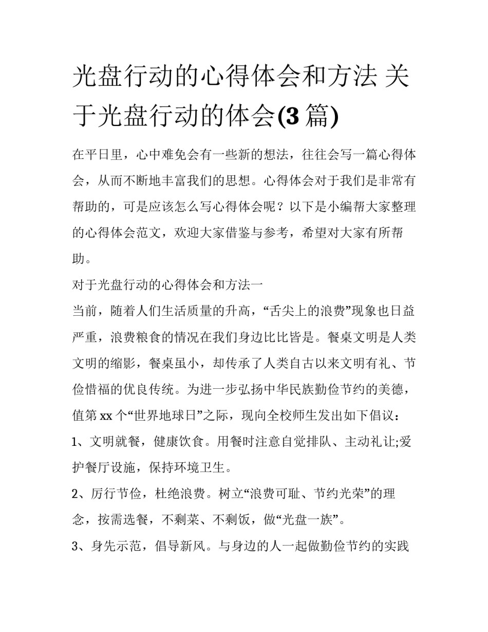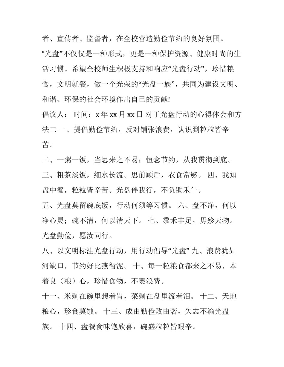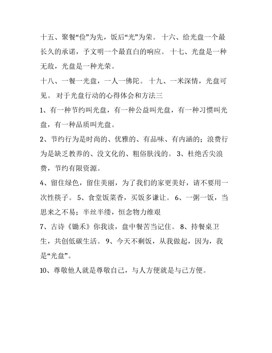 光盘行动的心得体会和方法关于光盘行动的体会(3篇)在平日里,心中难免会有一些新的想法,往往会写一篇心得体会,从而不断地丰富我们的思想。心得体会对于我们是非常有帮助的,可是应该怎么写心得体会呢?以下是小编帮大家整理的心得体会范文,欢迎大家借鉴与参考,希望对大家有所帮助。对于光盘行动的心得体会和方法一当前,随着人们生活质量的升高,“舌尖上的浪费”现象也日益严重,浪费粮食的情况在我们身边比比皆是。餐桌文明是人类文明的缩影,餐桌虽小,却传承了人类自古以来文明有礼、节俭惜福的优良传统。为进一步弘扬中华民族勤俭节约的美德,值第xx个“世界地球日”之际,现向全校师生发出如下倡议:1、文明就餐,健康饮食。用餐时注意自觉排队、主动礼让;爱护餐厅设施,保持环境卫生。2、厉行节俭,杜绝浪费。树立“浪费可耻、节约光荣”的理念,按需选餐,不剩菜、不剩饭,做“光盘一族”。3、身先示范,倡导新风。与身边的人一起做勤俭节约的实践者、宣传者、监督者,在全校营造勤俭节约的良好氛围。“光盘”不仅仅是一种形式,更是一种保护资源、健康时尚的生活习惯。希望全校师生积极支持和响应“光盘行动”,珍惜粮食,文明就餐,做一个光荣的“光盘一族”,共同为建设文明、和谐、环保的社会环境作出自己的贡献!倡议人:时间:x年xx月xx日对于光盘行动的心得体会和方法二一、提倡勤俭节约,反对铺张浪费,认识到粒粒皆辛苦。二、一粥一饭,当思来之不易;恒念节约,从我贯彻到底。三、粗茶淡饭,细水长流。思前顾后,衣食常够。四、我知盘中餐,粒粒皆辛苦。光盘伴我行,不负锄禾午。五、光盘莫留碗底饭,行动何须等习惯。六、盘不净,何以净心灵;碗不清,何以清天下。七、黍禾丰足,毋殄天物。光盘勤俭,愿汝同行。八、以文明标注光盘行动,用行动倡导“光盘”九、浪费犹如河缺口,节约好比燕衔泥。十、每一粒粮食都来之不易,本着良(粮)心,珍惜食物,不要浪费。十一、米剩在碗里想着胃,菜剩在盘里流着泪。十二、天地粮心,珍食莫蚀。十三、成由勤俭败由奢,矢志不渝光盘族。十四、盘餐食味饱欣喜,碗盛粒粒皆艰辛。十五、聚餐“俭”为先,饭后“光”为荣。十六、给光盘一个最长久的承诺,予文明一个最直白的响应。十七、光盘是一种无敌,光盘是一种光荣。十八、一餐一光盘,一人一佛陀。十九、一米深情,光盘可见。对于光盘行动的心得体会和方法三1、有一种节约叫光盘,有一种公益叫光盘,有一种习惯叫光盘,有一种品质叫光盘。2、节约行为是时尚的、优雅的、有品味、有内涵的;浪费行为是缺乏教养的、没文化的、粗俗肤浅的。3、杜绝舌尖浪费,节约有限资源。4、留住绿色,留住美丽,为了我们的家更美好,请不要用一次性筷子。5、食堂饭菜香,买饭多谦让。6、一粥一饭,当思来之不易;半丝半缕,恒念物力维艰7、古诗《锄禾》你我读,盘中餐苦当记住。8、持餐桌卫生,共创低碳生活。9、今天不剩饭,从我做起,因为,我是“光盘”。10、尊敬他人就是尊敬自己,与人方便就是与己方便。